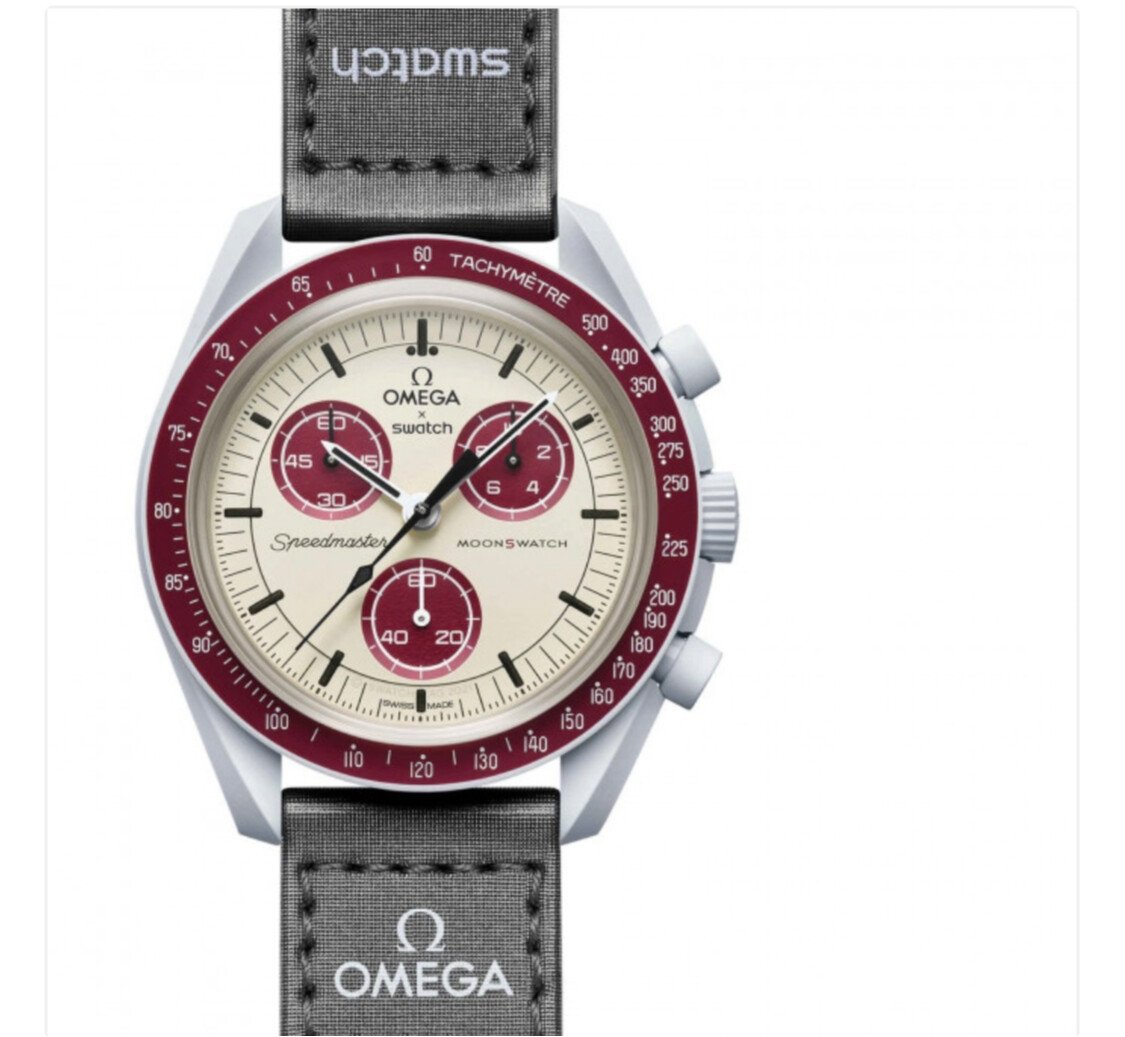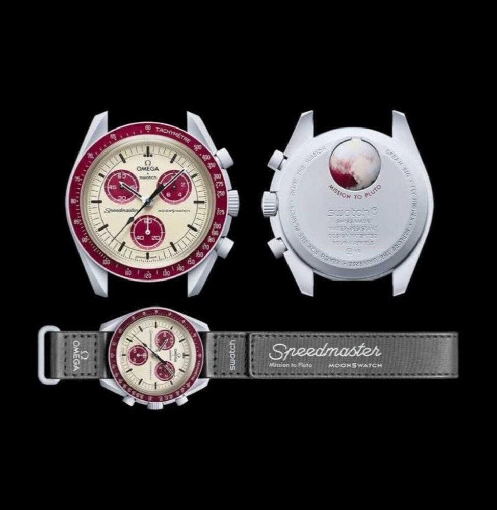 The Swatch x Omega Bioceramic Moonswatch Mission to Mars (SO33R100) pays tribute to our planetary neighbor by showcasing bright red tones contrasted with a white velcro strap. Both subdials are shaped like a rocket shape, perhaps in reference to humanity’s curiosity and long-time goal of reaching Mars. The Swatch x Omega Moonswatch Mission to Mars (SO33R100) features quartz movement, superluminova hours, minutes, and second hands, and is 3 bar water resistant.