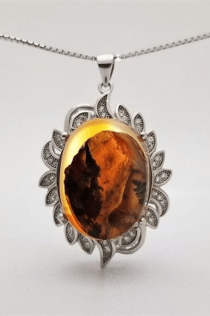 قلادة نسائية متوسطة الشكل، مصنوعة من الفضة الخالصة عيار 925، مطلية بالروديوم، و مرصعة باحجار الزركون الأبيض، والحجر الرئيسي من العقيق اليماني المصور النادر الأصلي، على شكل ملامح وجه، شكل الحجر بيضاوي ساده، شفاف وطبيعي 100%.
