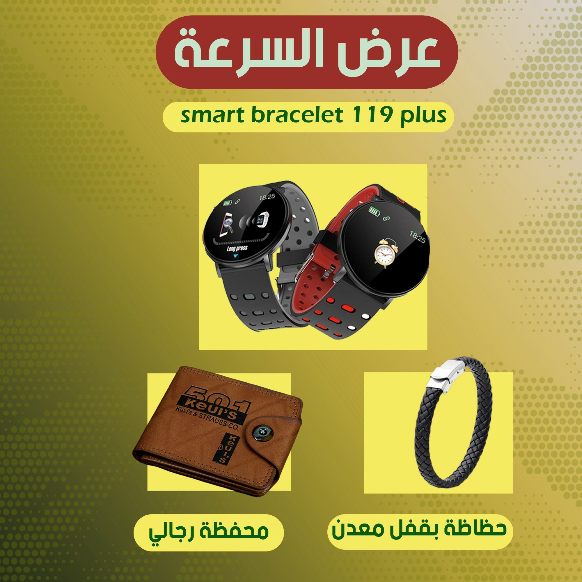 عرض ( Smart Bracelet 119 PLUS أسود + حظاظة يد بقفل معدن + محفظة رجالي )