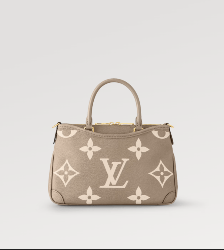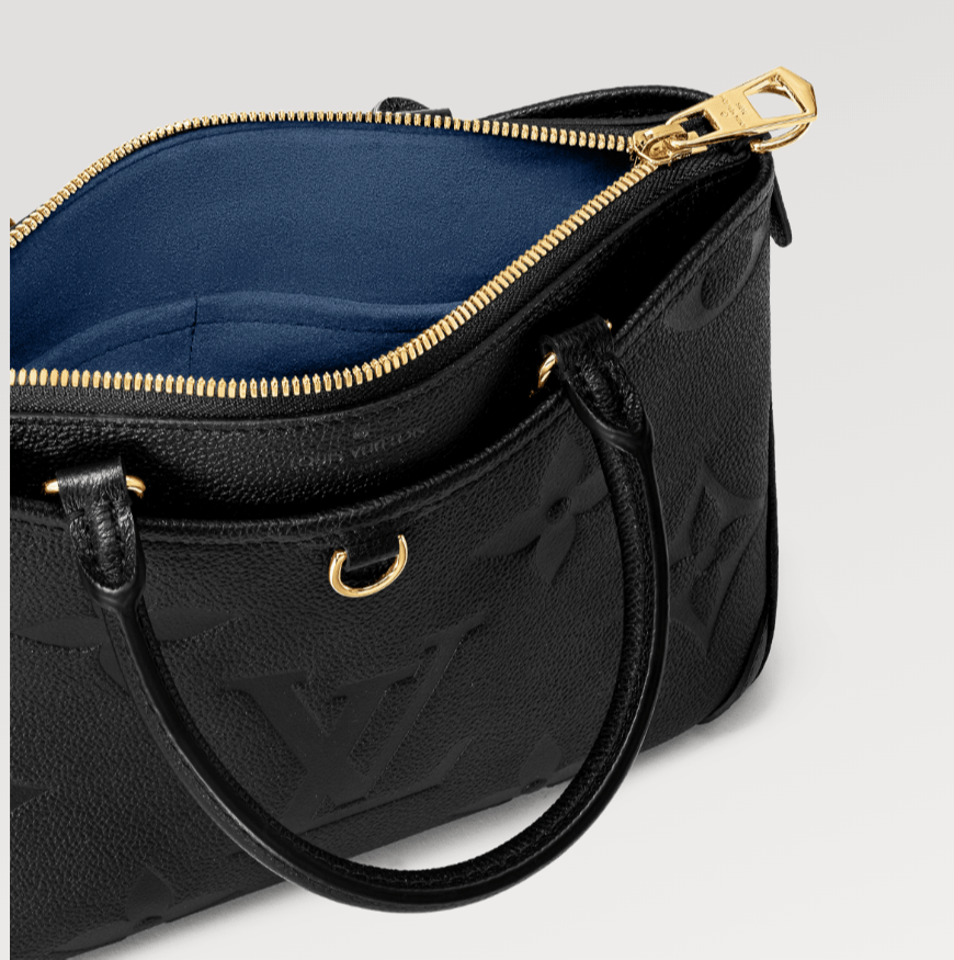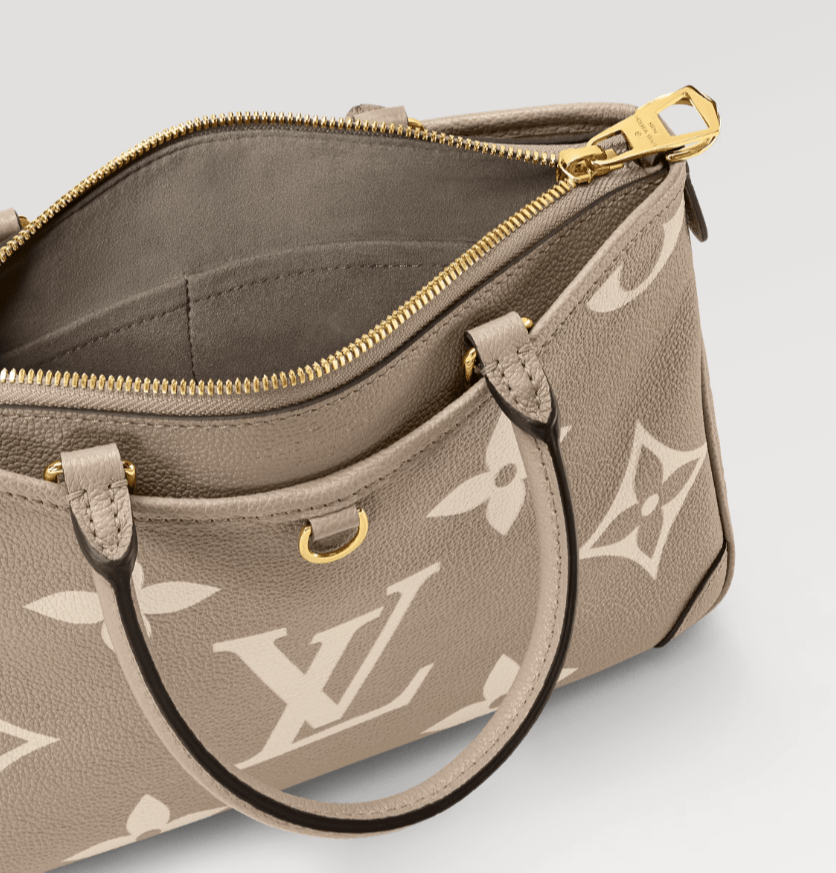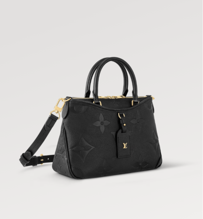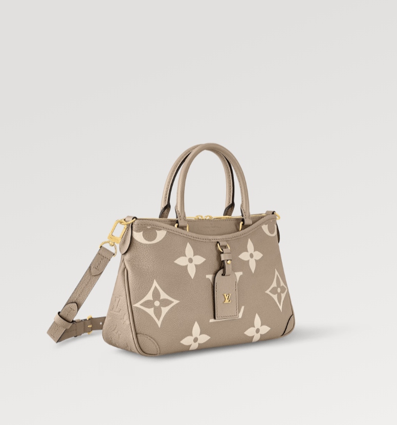 حقيبة Trianon PM، بتصميمها المميز على شكل حرف V، مصنوعة من جلد Monogram Empreinte المحبب مع نقش زهور Monogram وLV ثم طباعتها على الجلد بلون كريمي ناعم. حزام طويل قابل للتعديل والإزالة، بالإضافة إلى المقبضين العلويين . (Mirror Original)