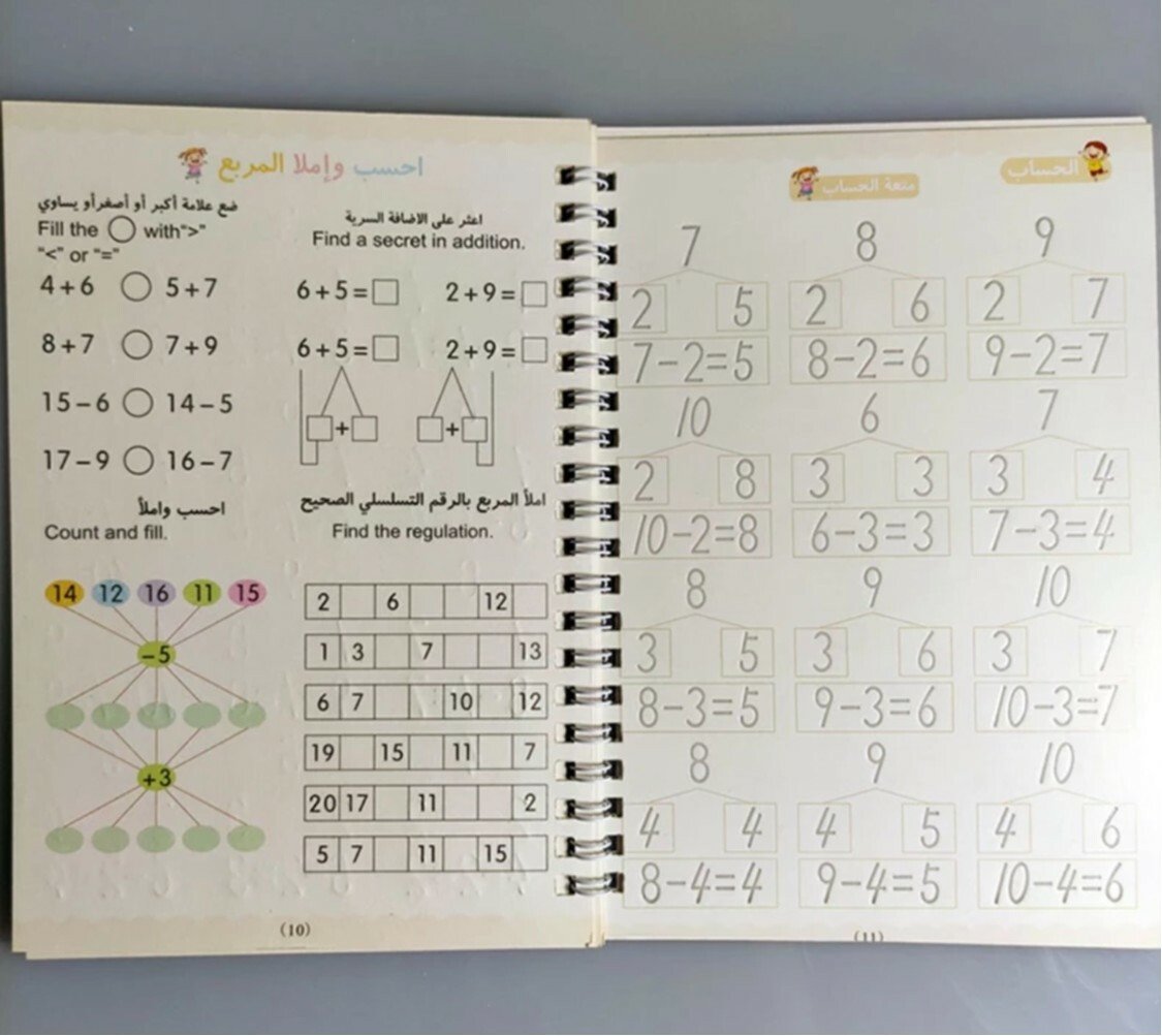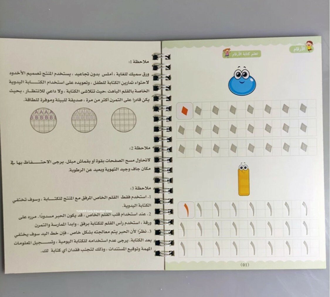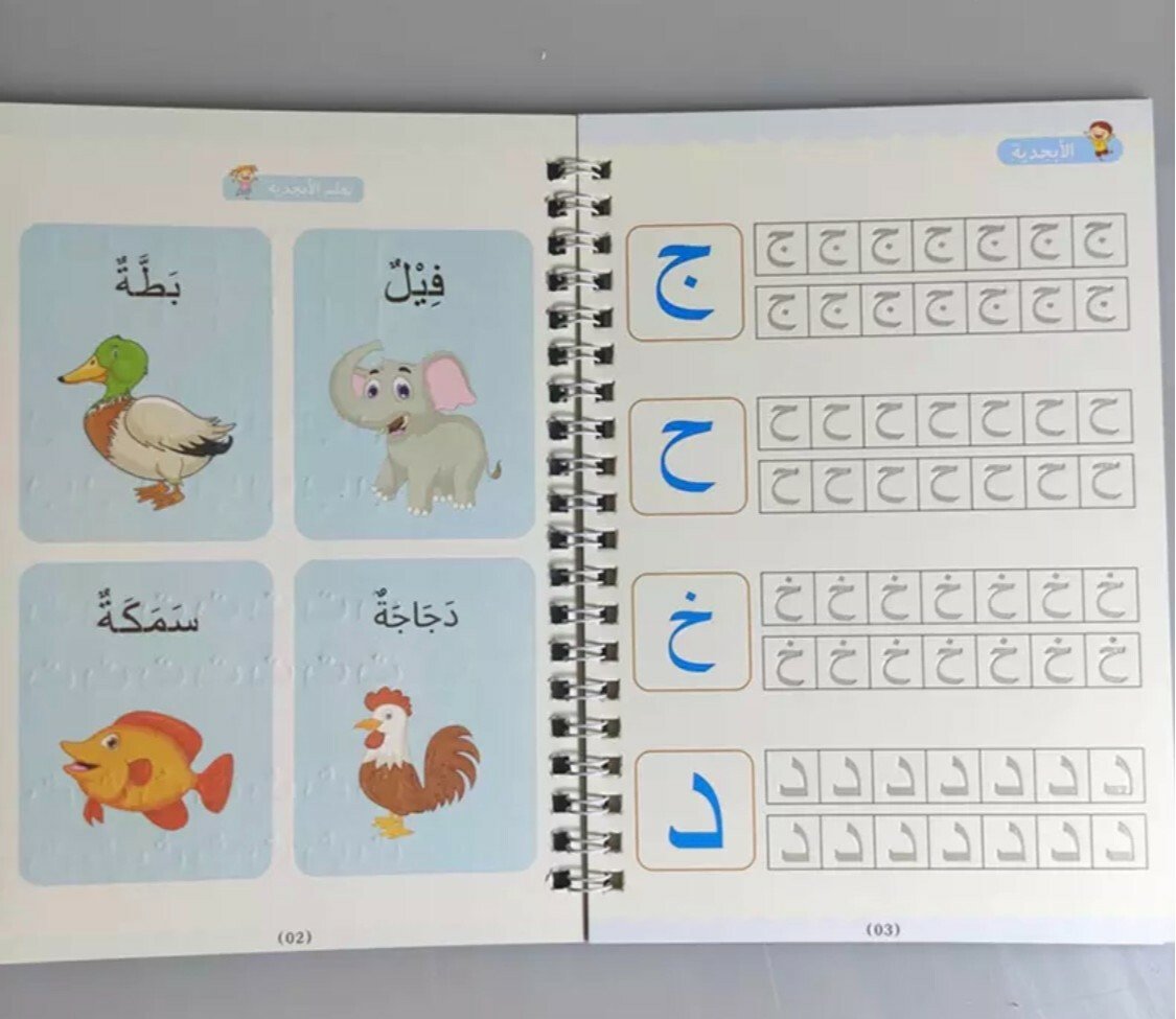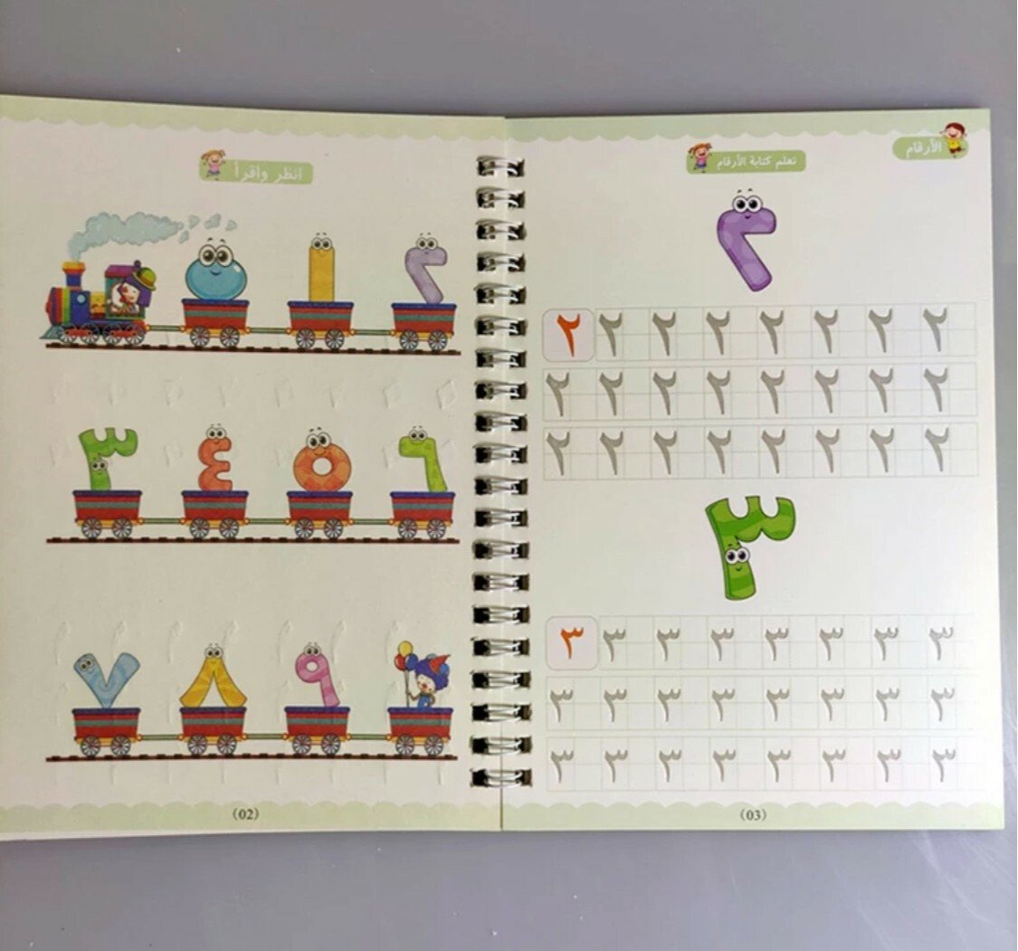 يتميز أن الخطوط شبه محفورة فتتحرك يد الطفل تلقائيا لترسم الشكل الصحيح ، ومع التكرار يتعود الطفل على الشكل الصحيح بخط جميل ويستطيع كتابتها بدون مساعدة وقابله لاعادة الاستخدام حيث ان الحبر يختفي تلقائيا بعد عشر دقائق من الاستخدام . بكج من اربع كتب 📕 الحروف العربية 📘الأرقام العربية. 📗رسم الاشكال والخطوط المستقيمة. 📙الجمع والطرح.