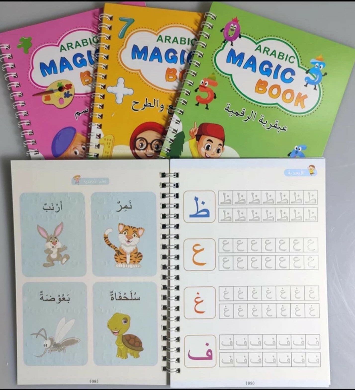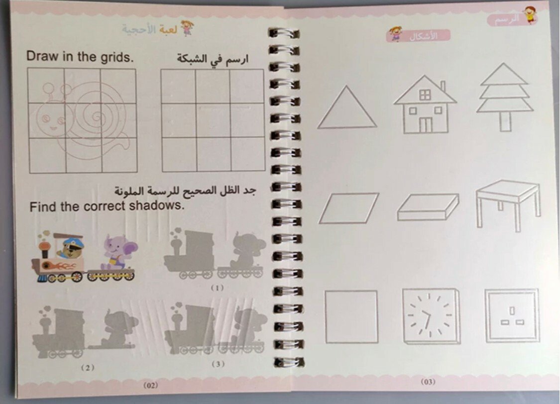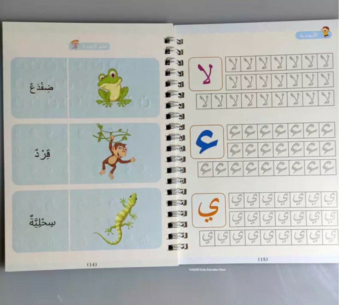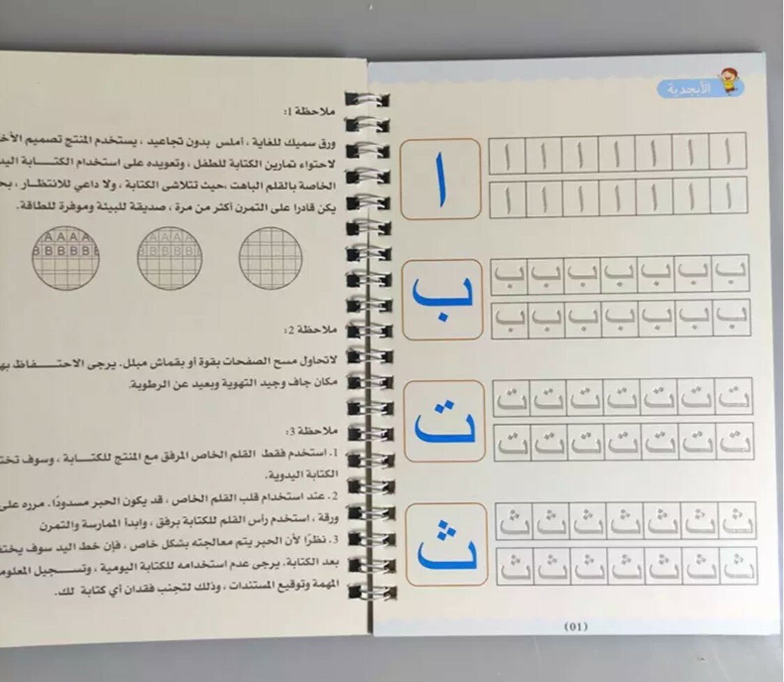 يتميز أن الخطوط شبه محفورة فتتحرك يد الطفل تلقائيا لترسم الشكل الصحيح ، ومع التكرار يتعود الطفل على الشكل الصحيح بخط جميل ويستطيع كتابتها بدون مساعدة وقابله لاعادة الاستخدام حيث ان الحبر يختفي تلقائيا بعد عشر دقائق من الاستخدام . بكج من اربع كتب 📕 الحروف العربية 📘الأرقام العربية. 📗رسم الاشكال والخطوط المستقيمة. 📙الجمع والطرح.
