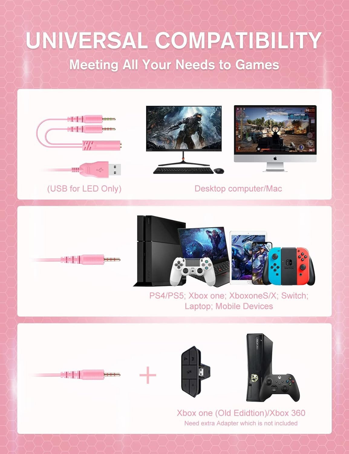 【سماعة رأس متعددة المنصات】 تدعم بلاي ستيشن 5، بلاي ستيشن 4، اكس بوكس ون/ ون اس، الكمبيوتر الشخصي، ماك، اللابتوب، بي اس بي، ايباد، التابلت، الجوال. [يلزم وجود محول مايكروسوفت إضافي (غير متضمن) عند الاتصال بالإصدار القديم من اكس بوكس ون]