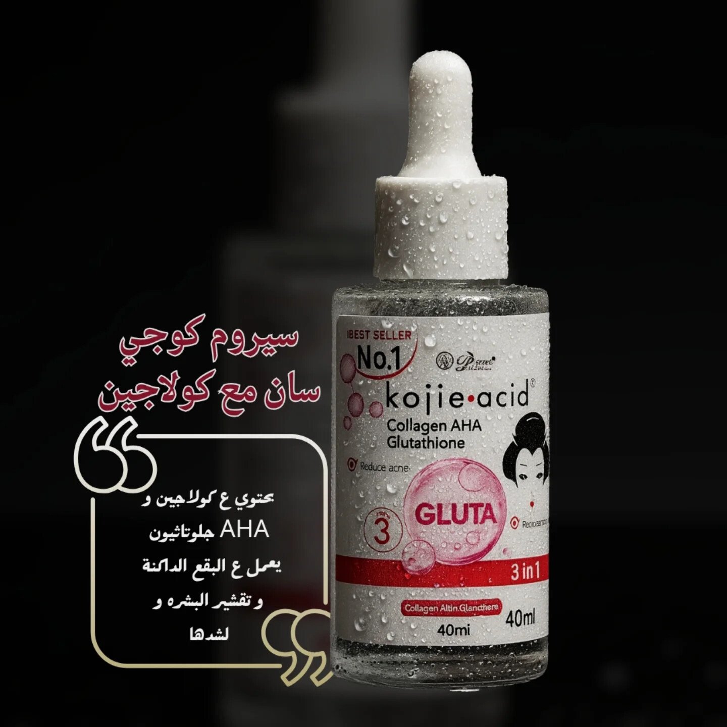 سيروم Kojie Acid Collagen AHA Glutathione X20 Whitening هو منتج للعناية بالبشرة مصمم للمساعدة في تفتيح البشرة وتقليل التصبغات. يحتوي على مكونات رئيسية مثل حمض الكوجيك (Kojic Acid)، الكولاجين، حمض ألفا هيدروكسي (AHA)، والجلوتاثيون.