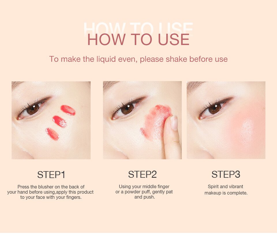 قبل استخدامه، يرجى هزه لأعلى ولأسفل لجعله متساويًا، ثم اضغط على رأس المضخة للحصول على الكمية المناسبة من السائل. بعد الانتهاء من وضع المكياج الأساسي، ضعيه على الخد مباشرة وسويه بالأصابع.