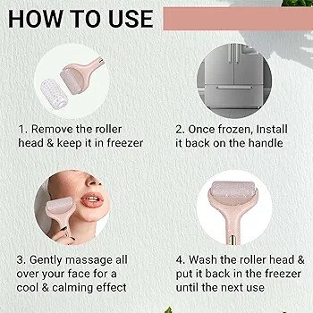 سهلة الاستخدام - انزع رأس البكرة وضعه في الفريزر. بمجرد التجميد، قم بتركيبه مرة أخرى على المقبض. دلكيه بلطف على وجهك للحصول على تأثير لطيف ومهدئ. بعد ذلك، اغسلي رأس الأسطوانة وضعيه مرة أخرى في الفريزر حتى الاستخدام التالي.