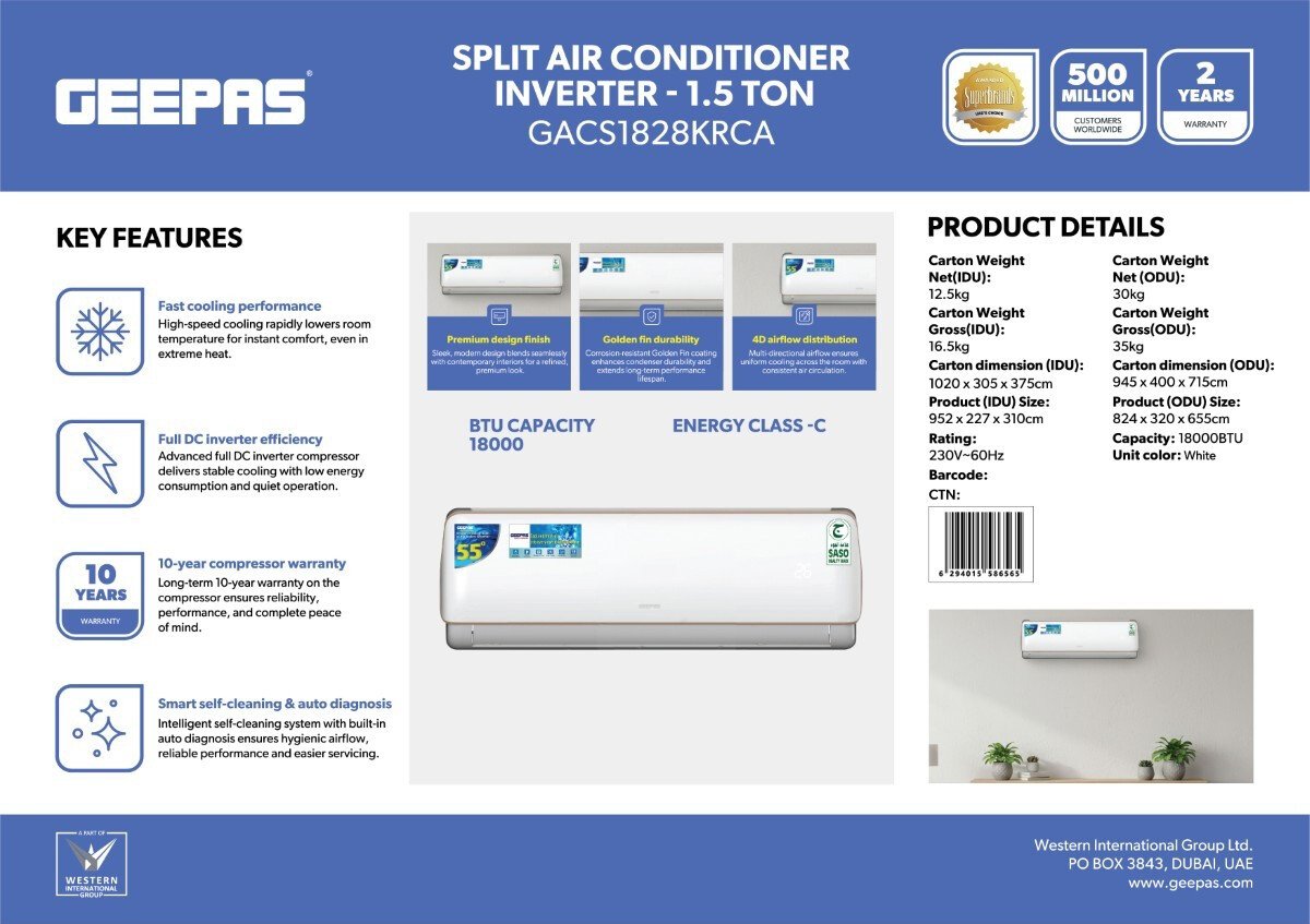 الوزن: الوحدة الداخلية (12.5 كجم صافي) / الوحدة الخارجية (30 كجم صافي).